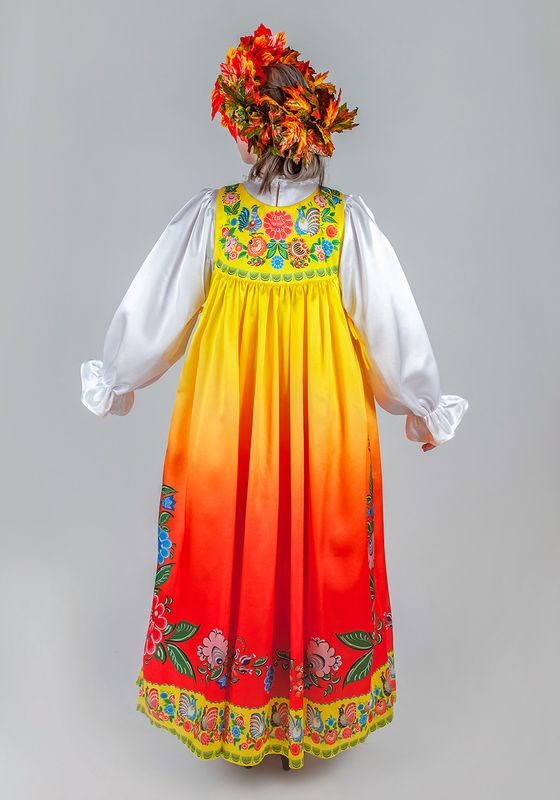 Городецкая роспись женский костюм Осень Женский сценический карнавальный костюм «Осень» незаменим для множества мероприятий и торжеств: от праздника Урожая до театральных и сказочных постановок. В комплект входят: длинная рубаха, сарафан-накидка, головной убор-венок. Рубаха выполнена из гладкоокрашенного креп-сатина – струящегося материала с блестящей лицевой поверхностью, визуально и на ощупь схожего с шелком и атласом. Фасон рубахи народный, силуэт прямой, свободный. Рукава втачные, длинные, широкие с ластовицами по бокам, резинкой внизу и сборкой по окату в верхней части. Низ рукава обработан бейкой, низ изделия – швом в подгибку. Рубаха на кокетке спереди и сзади, нижняя деталь на спинке присборена для придания объема. Горловина обработана бейкой и украшена тонким синтетическим кружевом. Застегивается рубаха сзади на небольшую пуговицу. Сарафан-накидка – самый красочный элемент женского костюма «Осень» выполнен из креп-сатина с подкладкой из хлопчатобумажной ткани. Накидка безразмерная – для подгона по фигуре по бокам предусмотрены завязки из бейки. Сарафан на отрезной кокетке с присборенной притачной нижней частью. Изделие украшено принтом с плавным градиентом и рисунками по мотивам городецкой росписи. Принт воспроизводит традиционные мотивы данного декоративно-прикладного промысла, поэтому костюм можно использовать не только для выступлений, но и в качестве наглядного дидактического пособия или же музейного экспоната. Головной убор выполнен в виде венка из искусственных зелено-оранжевых листьев. *Внешний вид венка может отличаться и будет зависеть от наличия расходных материалов. Венок подойдет на обхват головы 55-58 см. Уход: рубаха – машинная стирка, сарафан – ручная стирка, венок – химчистка. Хранить костюм в чехле, защищая изделия от пыли и света. Венок желательно хранить в расправленном виде, избегая сминания.