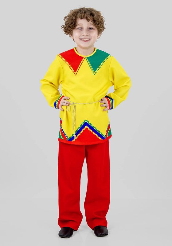 Веселые уголочки рубаха для мальчика Детская карнавальная рубашка - универсальное изделие, которое будет применимо к различным мероприятиям и не залежится в костюмерной. Рубаха оформлена в ярких базовых цветах: ярко-жёлтая основа с рисунком в красном, зелёном и синем цветах. Представления с фольклорной тематикой, создание образов скомороха и клоуна, ярмарочные и масленичные гуляния, русские народные танцевальные номера - рубаха "Веселые уголочки" пригодится везде. Рубаха свободного прямого кроя длиной до середины бедра с прямыми втачными рукавами. Низ рукавов и низ основы обработаны швом в подгибку с открытым обмётанным срезом. Горловина обработана косой бейкой, переходящей в застёжку на навесную петлю и пуговицу по среднему шву спинки. По линии талии рубаха подпоясывается поясом из витого шнура. Рубаха изготовлена из габардина - ткань полотняного переплетения, состав 100% полиэстер, плотность 180 г/кв.м. На ткань на современном японском оборудовании Mimaki при помощи сублимационной печати нанесён принт стойкими гипоаллергенными чернилами, которые не линяют при стирке и не выцветают со временем. Рисунок принта нейтральный и напоминает лоскутное шитьё. Рукава по низу украшены цветными и волнистыми полосами, имитирующими нашитые ленты или лоскуты ткани и настроченную тесьму-вьюн. По низу рубахи на полочке и на спинке нанесён геометрический орнамент из крупных треугольников-лоскутов, цветных полос и имитации настроченной тесьмы-вьюн. По переду у горловины крупные симметричные треугольники умитируют отложной воротник с тесьмой-вьюн по периметру. Изделие представлено в трёх размерах на рост: 110-116 см., 122-128 см. и 132-134 см. Набор для рукоделия включает в себя все необходимые материалы для самостоятельного изготовления изделия: инструкцию по пошиву, ткань с нанесенными деталями кроя, швейную фурнитуру. Рекомендации по уходу за рубахой: - деликатная стирка при температуре до 30°C без отбеливателей; - глажка при температуре 110-150°C; - хранить в чехле, защищая от пыли и солнечного света.