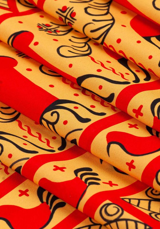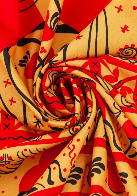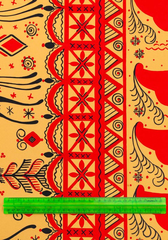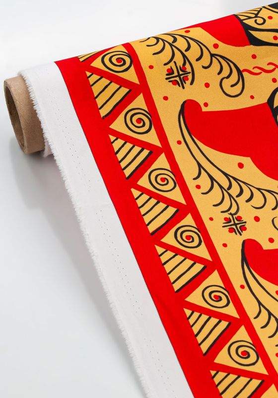 Ткань «Мезенская роспись» - это русский народный орнамент. Ткань для пошива в традиционном русском стиле с колоритным узором Мезенская роспись знают во всем мире.Традиционными считаются цвета: красный орнамент на желтом фоне. Все эти классические цвета есть в нашей палитре ткани «Мезенская роспись». Художники Мастерской Ангел при составлении узора оставляют самые характерные элементы, сохраняя традиции русской прикладной живописи.Узор состоит из крупных элементов сказочного мира, нанесенным на поверхность ткани. Такая ткань будет эффектно выглядеть на сцене и на выступлении русского народного хора или ансамбля русского народного танца. Яркие образы сказочных животных в узорах Мезенской росписи отражают сказочность былин русской культуры. Эту прекрасную традицию сохраняют сегодня художники Мастерской Ангел, украшая ткань нарядной росписью.Ткань для карнавальных костюмов или выступлений на сцене от Мастерской Ангел можно стирать после каждого выступления. Цвета оставляют свою яркость, а фактура ткани не деформируется.Ткань для пошива русских народных костюмов, сарафана, рубахи, пелерины, кокошника, жилета, коротены, кафтана, кички рогатой, поневы, передника, сороки, картуза. Ткань «Мезенская роспись» — это классическая палитра красок для шитья предметов одежды в исконно русском стиле для фольклорных ансамблей и народно-этнографичесских коллективов, певческих хоров. Наследие традиций русской культуры запечатлено в узорчатых рисунках на ткани Мастерской Ангел. Русский образ уместен не только для проведения тематических мероприятий. Карнавальный костюм, пошитый из ткани «Мезенская роспись», может использоваться на праздничные выступления на масленичных гуляньях. На ткань нанесён принтованный рисунок авторской работы по уникальным эскизам, имитирующий старинный русский промысел – Мезенская роспись с классическим узором.Больше тканей для пошива костюмов или декора в русском народном стиле смотрите в разделе Ткани для костюмов.В Мастерской Ангел вы можете купить русскую народную ткань из любого материала: креп-сатин, шифон, габардин.