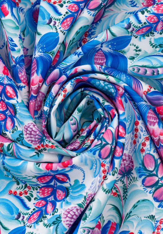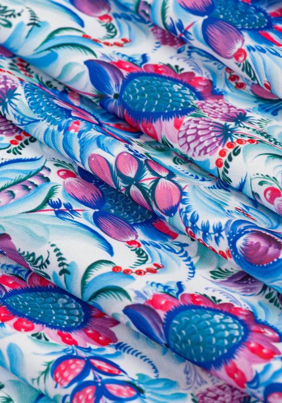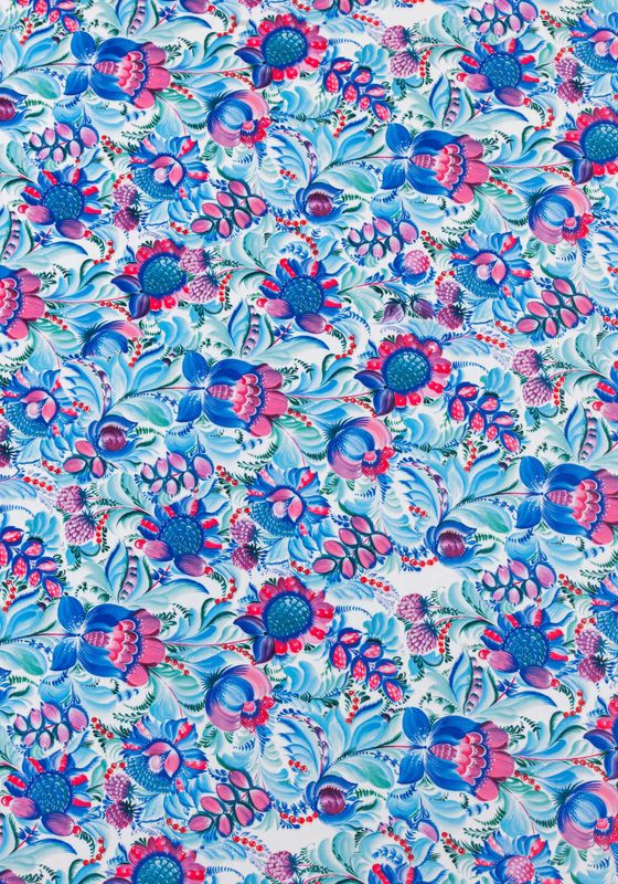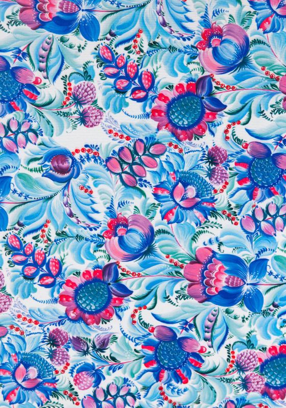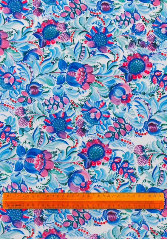 Ткань Петриковская роспись Ткань «Петриковская роспись» — роспись с русскими народными узорами. Мастерская Ангел создаёт ткань по канонам русских традиций. Ткань «Петриковская роспись» - это рисунок, созданный в Мастерской Ангел художниками по росписи.«Петриковская роспись» — буйство всех оттенков синего на светлом фоне с добавлением ярких розовых оттенков.Мастерская Ангел создает ткань на любом виде материала: габардин, шифон, креп-сатен. Вы можете подобрать ткань для пошива карнавальных костюмов или нарядов для выступления на сцене, декора интерьера, пошива рубах, сарафанов, кокошников, блуз и юбок. Карнавальный костюм, пошитый из ткани в русском народном стиле, идеально подходит для сценических выступлений ансамблей русской народной песни и танца, фольклорных и народных коллективов. Ткань удобно стирать в обычной машинке при температуре 40°С градусов, она сохраняет насыщенность цвета и форму. Больше тканей в русском народном стиле для воплощения ваших идей смотрите в разделе Ткани для костюмов.