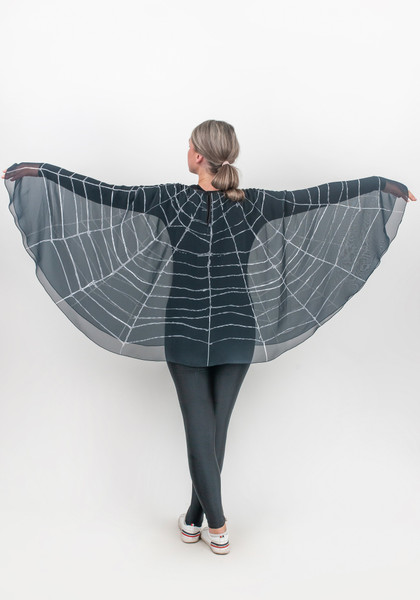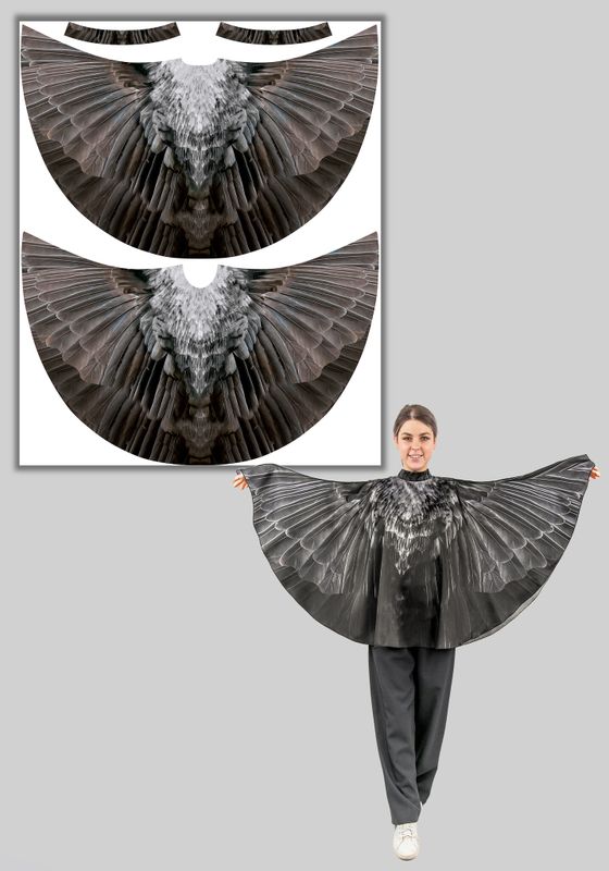 Ворон / Ворона пончо для взрослых Пончо Ворона/Вороны - это оригинальное решение, которое может заменить полноценный карнавальный костюм на утренниках, театральных или сказочных постановках в детских садах, школах и Домах Культуры. Пончо свободное с воротником-стойка. Застежка сзади на пуговицу на воротнике. Нижний край изделия обработан микрооверлоком. По низу пелерины птицы по боковым швам пришиты петельки, которые фиксируются на пальце руки, что позволяет создать реалистичный эффект маха крыла. Изготовлено из ткани креп-сатин – 100% полиэстер. Материал не растягивается и не деформируется, быстро высыхает после стирки, хорошо сохраняет форму, не линяет, не подвержен действию ультрафиолетовых лучей, не мнется и прекрасно утюжится. Плотность ткани от 160 до 180 г/м². На ткань нанесен авторский принтованный рисунок дизайнерской работы стилизованного изображения оперения ворона. Каждое перышко кропотливо прорисовано кистью художника. Допускается бережная ручная стирка при 30°C. Пончо Ворона вы можете сделать самостоятельно и в два раза выгоднее. Набор для рукоделия включает в себя все необходимые материалы для самостоятельного изготовления: инструкцию по пошиву, ткань с нанесенными деталями кроя, швейную фурнитуру.