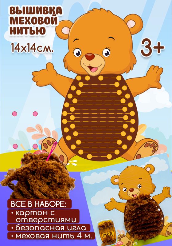 Набор для вышивания меховой нитью / МедведьНабор для увлекательного и простого изготовления красочной картинки, на которую не только приятно смотреть, но и трогать!На плотном картоне выполнен рисунок миленького Медведя с реалистичными объемными иголками.В процессе работы ребёнок оплетает заготовку пряжей по схеме. Ваш ребенок легко и с интересом справится с работой благодаря перфорации на бумаге и наглядной инструкции. Безопасная пластмассовая игла не позволит пораниться.В наборе:- бумажная цветная основа с рисунком и схемой;- пряжа;- безопасная игла;Набор для вышивания способствует развитию мелкой моторики рук, зрительного и тактильного восприятия, внимания и усидчивости.Набор рассчитан для детей от 3-х лет.Готовая картинка станет прекрасным подарком для родных и друзей или просто украшением детской комнаты.Рисунок нанесен стойкими красками.Размер мозаики: 15х15 см.
