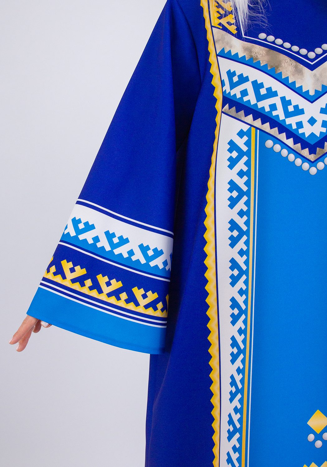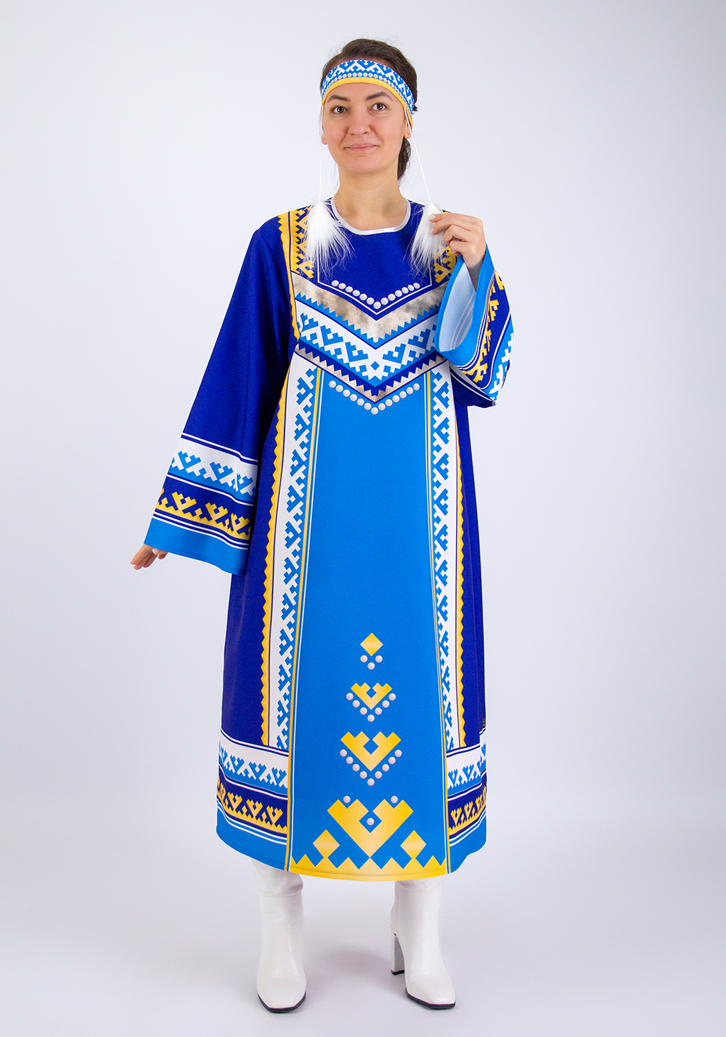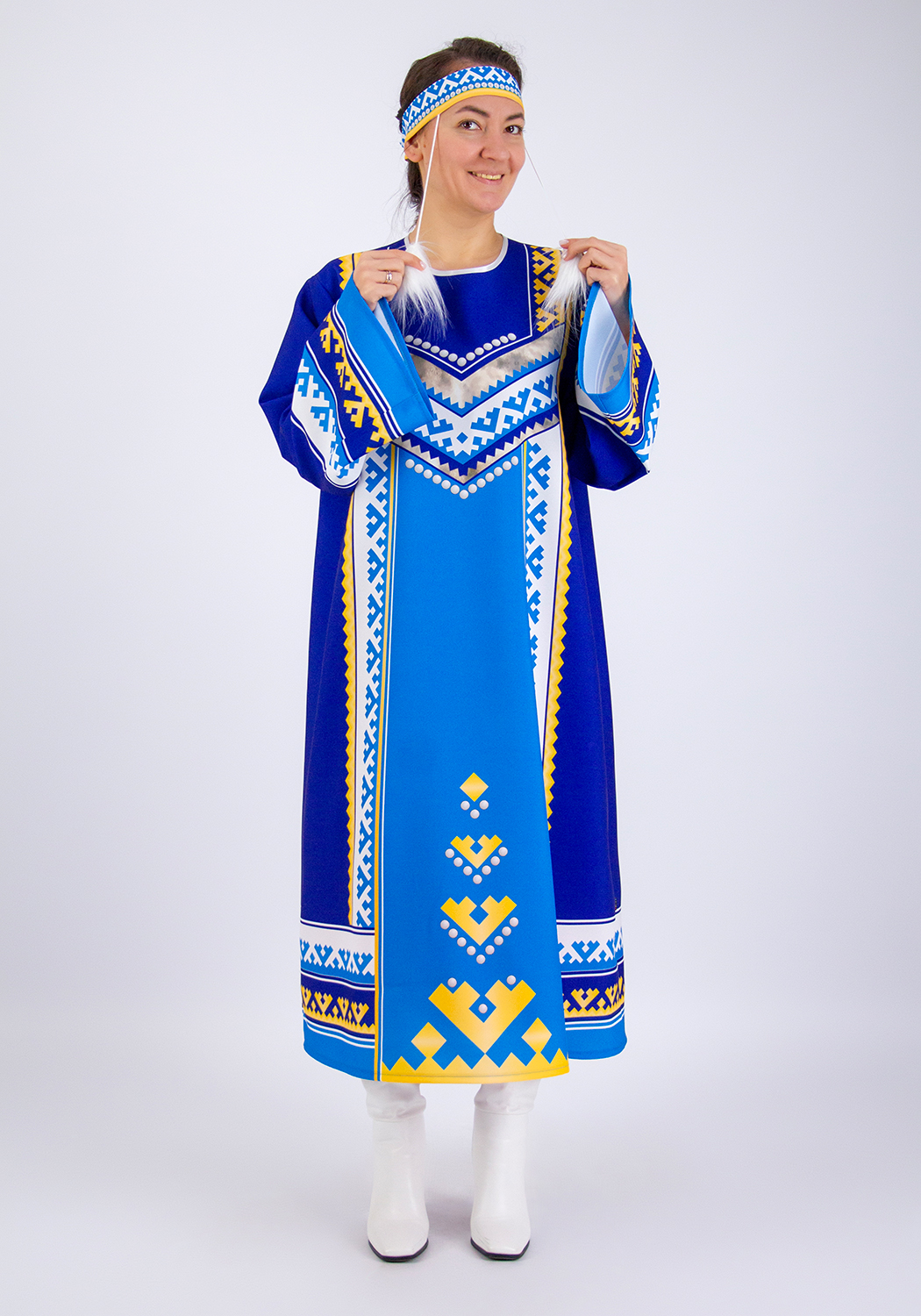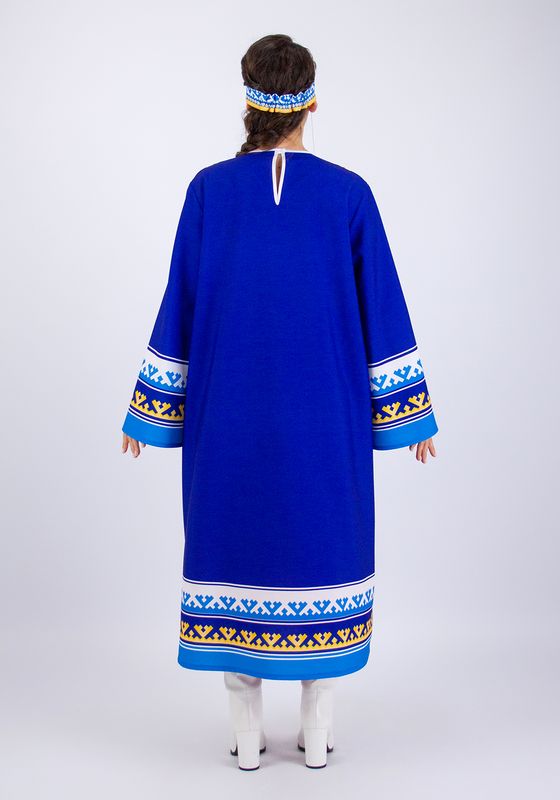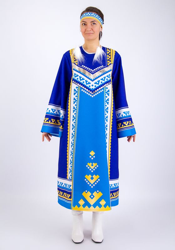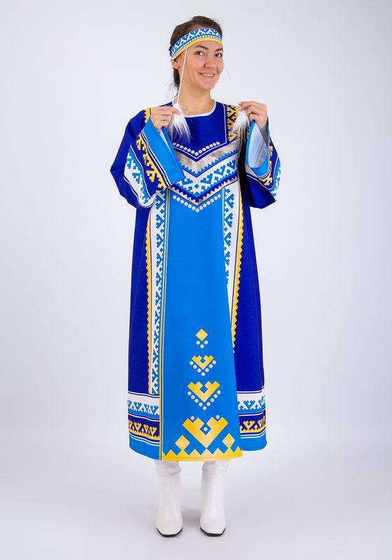 Женский стилизованный карнавальный костюм, создан для выступлений на утренниках, концертах, спектаклях, творческих конкурсах и тематических занятиях. Костюм передает экзотическую красоту и колорит одеяний народов севера. Прочная износостойкая ткань габардин украшена рисунком национального северного орнамента, созданным специально для этого костюма художниками Мастерской Ангел. Принтованный рисунок нанесён на ткань при помощи сублимационной печати гипоаллергенными стойкими красками. Принт не выгорает со временем, и сохраняет свою яркость даже после неоднократной стирки.
