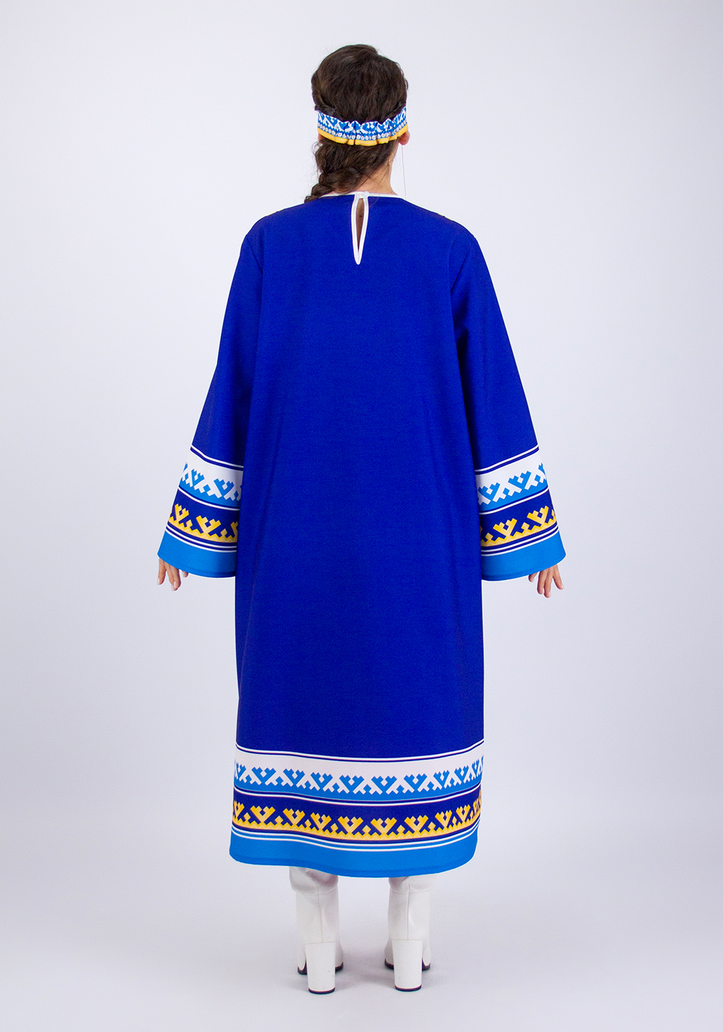 Дополняет костюм и завершает образ головной убор в виде налобной широкой полоски, размер 55-58. Для надёжной фиксации на голове сзади, в полоску вшита резинка. По бокам на уровне висков изделие украшено шнурками с кистями из белого меха.