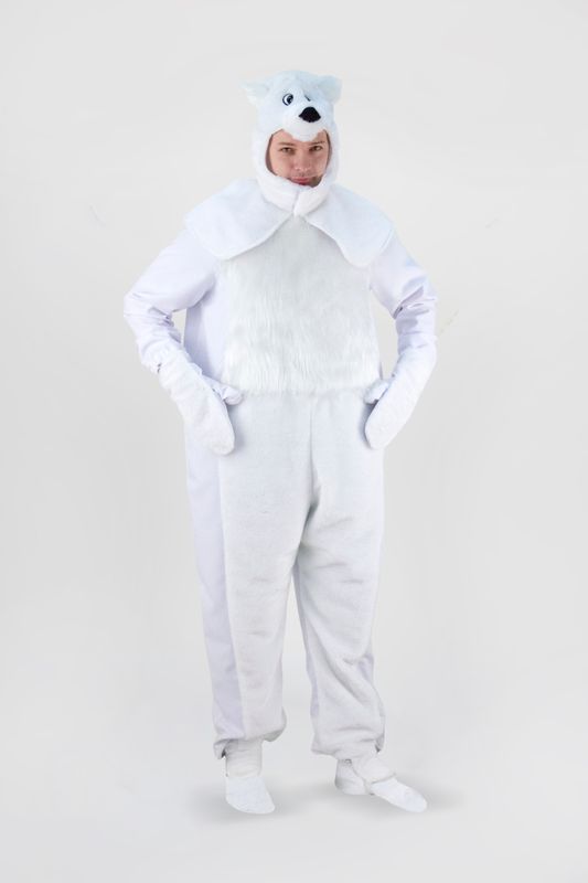 Белый Медведь костюм для взрослого Костюм Медведя предназначен для новогодних утренников, народных гуляний, спектаклей и праздников, в том числе, на свежем воздухе. Комбинезон выполнен из плотного износостойкого габардина на подкладке и искусственного меха. Состав — 100% полиэстер. В области пояса вшит регилин, который не только создает дополнительный объем и поддерживает форму костюма, но и позволяет воздуху свободно циркулировать, что обеспечивает артисту комфорт нахождения в костюме. Грудь и холка Медведя отделаны длинноворсным белым мехом, а сзади пришит меховой медвежий хвост. Внизу к штанам пришиты резинки для того, чтобы их надевать на обувь и маскировать ее. Костюм надежно застегивается на спине на молнию. Головной убор представляет собой мордочку Медведя из искусственного меха. Важная конструктивная особенность этого головного убора в том, что он оставляет открытым лицо, но, при этом, закрывает шею и плечи за счет несъемной меховой пелерины. Застегивается головной убор в области шеи на прочную контактную застежку. Рукавицы костюма также выполнены из габардина на подкладке с отделкой их мягкого меха. Костюм Медведя прослужит несколько десятков лет, если за ним бережно ухаживать. Стирайте его в прохладной воде при температуре 30°C только вручную, храните в защищенном от пыли и дневного света месте в специальном чехле.