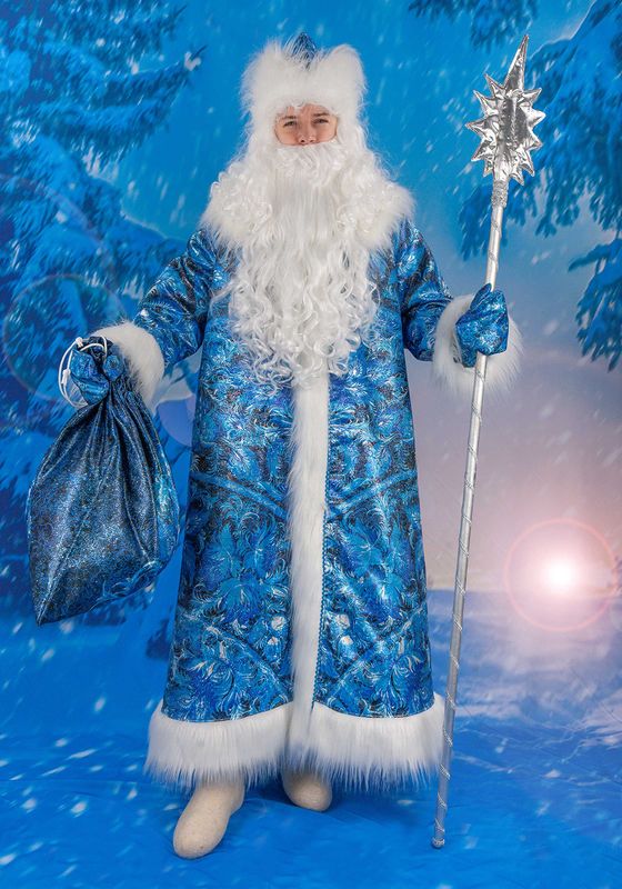 Дед Мороз Ледяной Узор из парчи Карнавальный костюм Деда Мороза - это воплощение образа одного из самых долгожданных героев на детском утреннике, новогодней елке в школах и Домах Культуры. Деда Мороза ждут и дети, и взрослые. Он ассоциируется с волшебством и настоящей зимней сказкой. Костюм выполнен из парчи - ткань жаккард, 100% полиэстер, плотная, жесткая, шуршащая ткань с крупным орнаментом, выполненным металлическими серебряными нитями. Материал формоустойчивый, хорошо драпируется, практически не мнется. Особенностью костюма является оригинальный авторский принт – зимние ледяные узоры. Рисунок нанесен при помощи сублимационной печати с использованием стойких гипоаллергенных красок. Костюм подойдет на 50-56 размеры. Костюм Деда Мороза состоит из шубы, шапки, рукавиц и мешка. *Посох, борода с париком и валенки приобретаются отдельно. Длинная шуба свободного прямого силуэта на утепленной подкладке. Изделие застегивается спереди на пуговицы, которые замаскированы меховым бортом. Широкие прямые рукава снизу обработаны меховой манжетой. Горловина оформлена широким меховым воротником. По низу шубы пришита меховая опушка. Шапка выполнена на основе пилотки на утепленной подкладке. По низу выполнен большой меховой отворот. Дополняют образ Деда Мороза рукавицы и объемный мешок с завязками. Костюм будет служить десятилетиями, если за ним бережно ухаживать. Загрязнения очищать при помощи сухой щетки, при сильном загрязнении допустима ручная чистка в теплой воде. Сушить нужно в естественных условиях, не допуская высоких температур. Изделия из парчи можно не утюжить, так как она практически не сминается. При необходимости пройтись утюгом при температуре не выше 110°С с изнаночной стороны с использованием проутюжильника. Мех расчесывать частой щеткой по направлению ворса. Для предотвращения статического электричества мех можно обработать антистатиком. На хранение убирайте костюм в чехол, защищая его от пыли и дневного света.