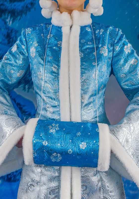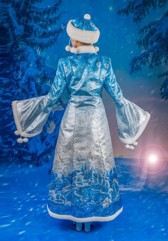 Снегурочка Русская сказка из парчи Костюм Снегурочки — идеальный наряд для создания волшебной атмосферы на праздниках! Он прекрасно подойдет для новогоднего утренника, добавляя праздничности и яркости каждому мероприятию. Снегурочка, как верная помощница Деда Мороза, станет ярким символом радости и веселья, принося детям смех и удивление. Комплектация: головной убор, шуба, муфта. Костюм Снегурочки изготовлен из бело-серебристой жаккардовой парчи на подкладке - состав 100% полиэстер. Парча украшена богатым орнаментом в виде сказочных морозных узоров. Шуба - платье приталенного силуэта, свободного кроя, застегивается спереди на пуговицы. Воротник - стойка, низ рукава, низ и борта шубы отделаны опушкой из меха. Рукав на подкладке, нижняя часть двойная: внешний - широкий, расклешенный и украшен помпонами из меха; нижний - зауженный. Такой рукав позволяет Снегурочке свободно поднимать руки, не обнажая их. Костюм не утеплен и рекомендуется использовать его только в помещениях! Свободный крой шубы позволяет надеть под нее утепленную подстежку.Головной убор Снегурочки - шапка Боярка из шести клиньев, на утеплённой подкладке, с широким меховым отворотом. Шапку украшают меховые помпоны, закрепленные на серебреной тесьме. Дополняет образ снежной красавицы муфта, которая служит как декоративный элемент. В муфте Снегурочка так же может прятать небольшие подарочки для детей. Муфта выполнена из парчи на подкладке. Края изделия обработаны мехом. Для удобства эксплуатации к муфте пришита лямка из тесьмы. На ткань нанесен авторский принт, разработанный Мастерской Ангел. Рисунок нанесен на ткань на современном японском оборудовании Mimaki при помощи сублимационной печати стойкими гипоаллергенными чернилами. Размеры: 46, 48, 50, 52; Рост универсальный: 164-170 см. Рекомендации по уходу: - парча - деликатный материал, который нельзя стирать и подвергать химической чистке! - рекомендуют очищать загрязнение с помощью сухой щетки; - хранить в чехле, защищая от пыли и солнечного света.