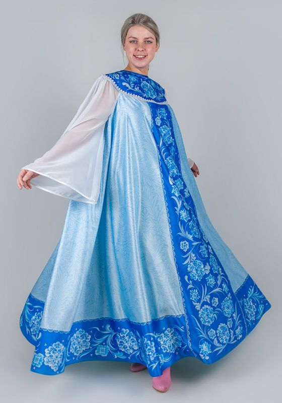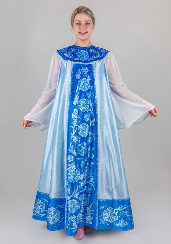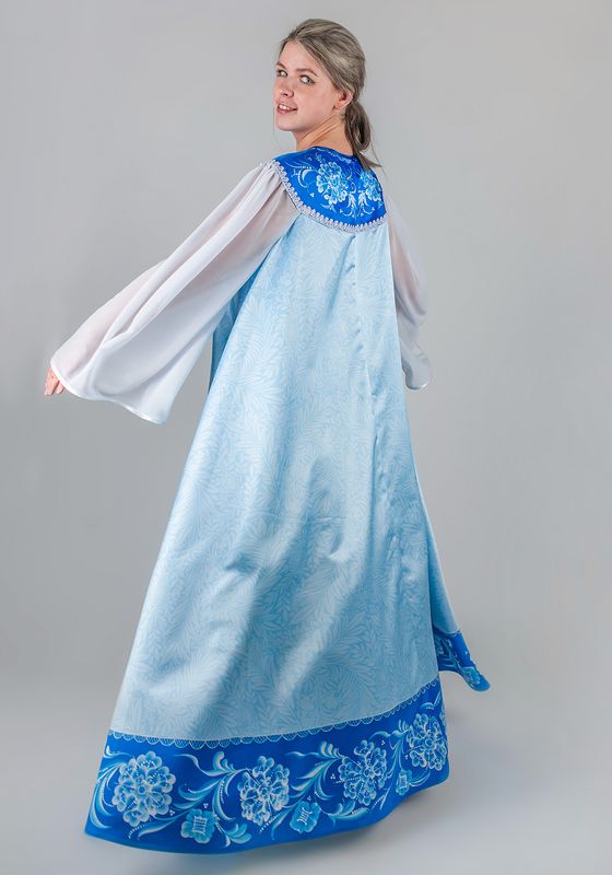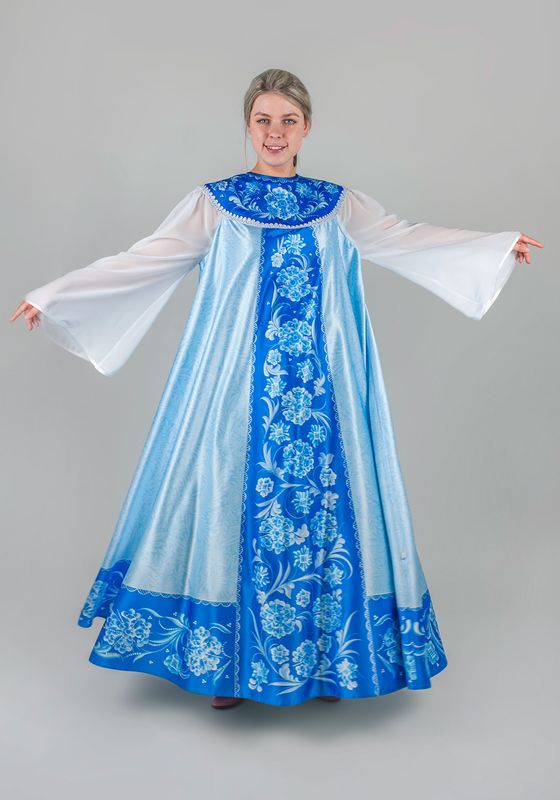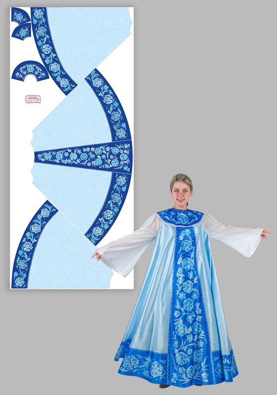 Зимушка / Метелица / Снегурочка Лебедушка платье. Женское карнавальное платье «Зимушка-Метелица», создаст образ холодной Зимы или красавицы Снегурочки на новогодних праздниках, утренниках и детских спектаклях. Выполнено в русском народном стиле, в удобном универсальном размере 46-56. Платье свободного кроя, расклешенное от груди, прекрасно смотрится на фигурах любой комплекции и не стесняет движений, обеспечивая комфорт во время представлений и игр с детьми. Платье в пол, выполнено из Сатена - ткань сатинового переплетения:100% полиэстер, плотность 180г/кв.м. Лицевая сторона материала шелковистая с приятным блеском, изнаночная сторона матовая с зернистой фактурой. Сатен, прочный и износостойкий материал, отлично держит форму и прекрасно драпируется. По переду и спинке широкая круглая кокетка, напоминающая оплечье. Длинные, расширенные рукава из белого шифона, придают образу легкость и очарование. Шифон - легкая полупрозрачная ткань, с ощутимой фактурой, 100% полиэстер, плотностью 60-90 г/м². Ткань изящно струится, переливается, легко драпируется, дарит комфорт и эстетичный внешний вид. Низ рукава и круглый вырез горловины, обработаны бейкой, а низ платья обработан швом в подгибку. Застегивается платье сзади на пуговицу. Низ кокетки декорирован ажурной тесьмой. На ткань нанесен авторский дизайнерский рисунок, который имитирует морозные узоры. Принт выполнен на современном японском оборудовании Mimaki при помощи сублимационной печати стойкими гипоаллергенными чернилами. Набор для рукоделия включает в себя все необходимые материалы для самостоятельного изготовления изделия: инструкцию по пошиву, ткань с нанесенными деталями кроя, швейную фурнитуру. Завершить образ Зимы или Снегурочки поможет корона. Рекомендации по уходу: - деликатная стирка при температуре до 30°C без отбеливателей; - глажка при температуре 110-120°C; - хранить в чехле, защищая от пыли и солнечного света.