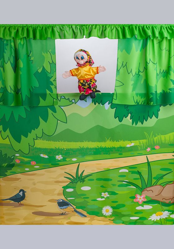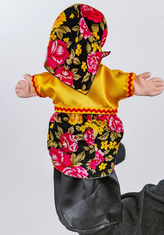 Перчаточная кукла БабкаРазвивающая перчаточная кукла Бибабо́ на взрослую руку, размер S - M. Бибабо́ - кукла, состоящая из головы и платья в виде перчатки. Голова имеет специальное отверстие под указательный палец, а большой и средний палец служат для жестикуляции руками куклы. Кукла длиной 40 см, ширина туловища - 15 см, размах рук 35 см. Перчаточная кукла, надетая на руку, закрывает кисть руки и запястье, доходит почти до локтя благодаря длиной нижней юбке - рукаву. Нижняя юбка выполнена из ткани креп - сатин черного цвета. Кукла выполнена в образе сказочного персонажа - Бабка.Кукла изготовлена из мягкого материала флис телесного цвета. Флис - синтетический трикотажный материал из полиэстера плотностью 200 г/м². Легкий, дышащий материал, приятный на ощупь, с высоким уровнем терморегуляции и гигроскопичности. Не является аллергеном. Объёмная голова куклы, с выступающим крючковатым носом, наполнена синтепоном. Ладошки куклы объемные - набитые синтепоном, с отсрочкой в виде пальцев. Кукла также с объёмными стопами, наполненными синтепоном. Ноги, пришитые по верхнему срезу нижней юбки спереди, выглядывают из-под одежды. Лицо нанесено на ткань принтованным рисунком. Волосы выполнены из белой пряжи - Акрил 100%.Кукла одета в однотонную блузку, цветастую юбку, головной убор - косынку. Блузка и косынка изготавливаются из ткани с гладкой, блестящей поверхностью. Низ рукавов и горловина на блузке обрабатывается тесьмой. Юбка выполнена из ткани с цветочным рисунком. Верхний срез юбки собран на резинку.