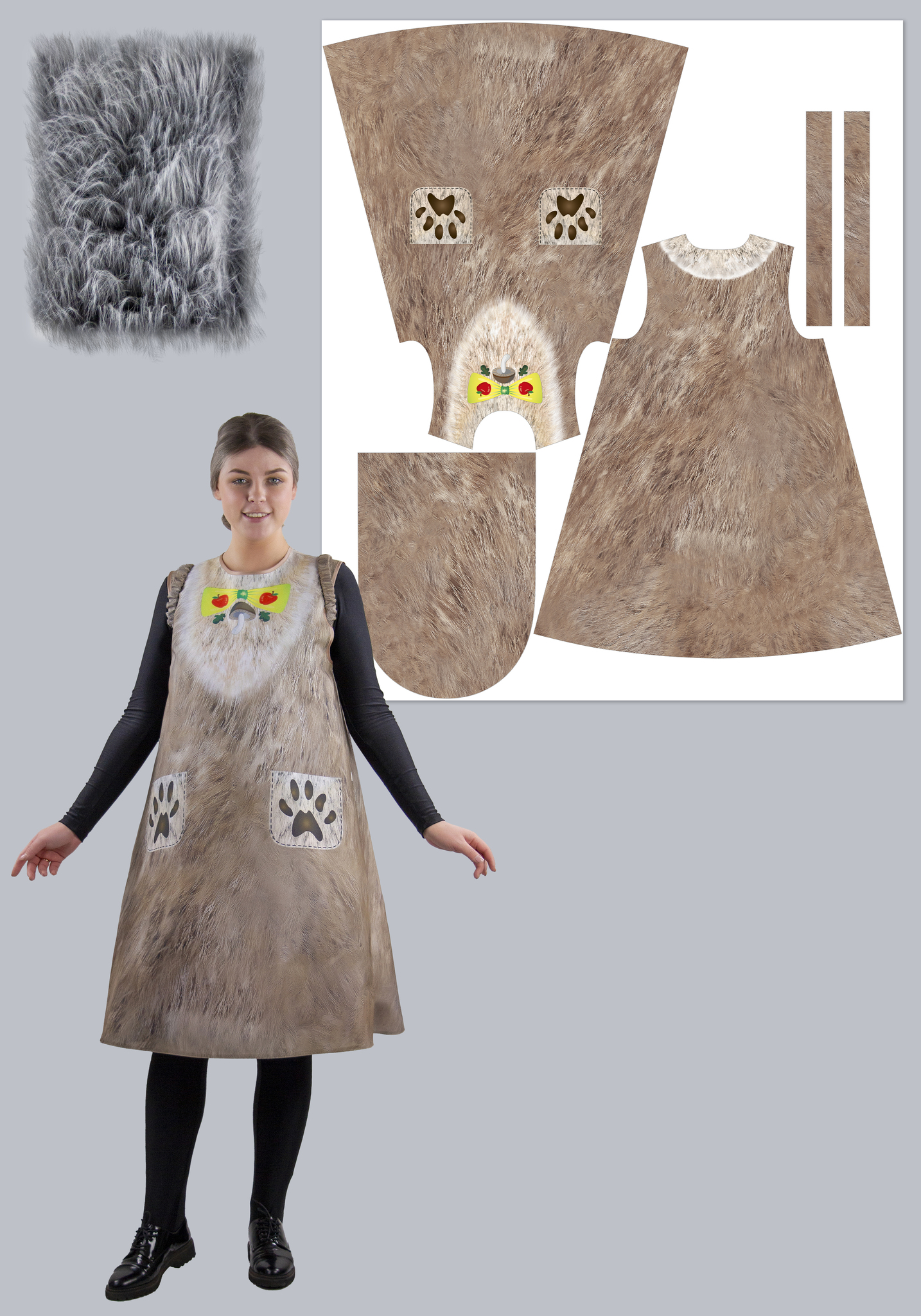 Платье выполнено из плотного износостойкого габардина с принтованным рисунком, нанесенным на ткань на современном промышленном оборудовании при помощи сублимационной печати. Для печати используются гипоаллергенные стойкие краски. Спереди выполнена имитация карманов с отпечатками лап и желтый бантик с яблоками и грибом на белой грудке. Материал: 100% полиэстер. Платье трапециевидной формы длиной ниже колен. Круглая горловина и проймы обработаны косой бейкой. Застегивается платье сзади по горловине на маленькую пуговицу. Низ платья обработан швом в подгибку. Удобное платье в двух универсальных размерах подойдет женщинам с любой комплекцией. В комплект к платью идет съемная спинка-"рюкзачок" из длинноворсового меха, имитирующая иголки ежика.
