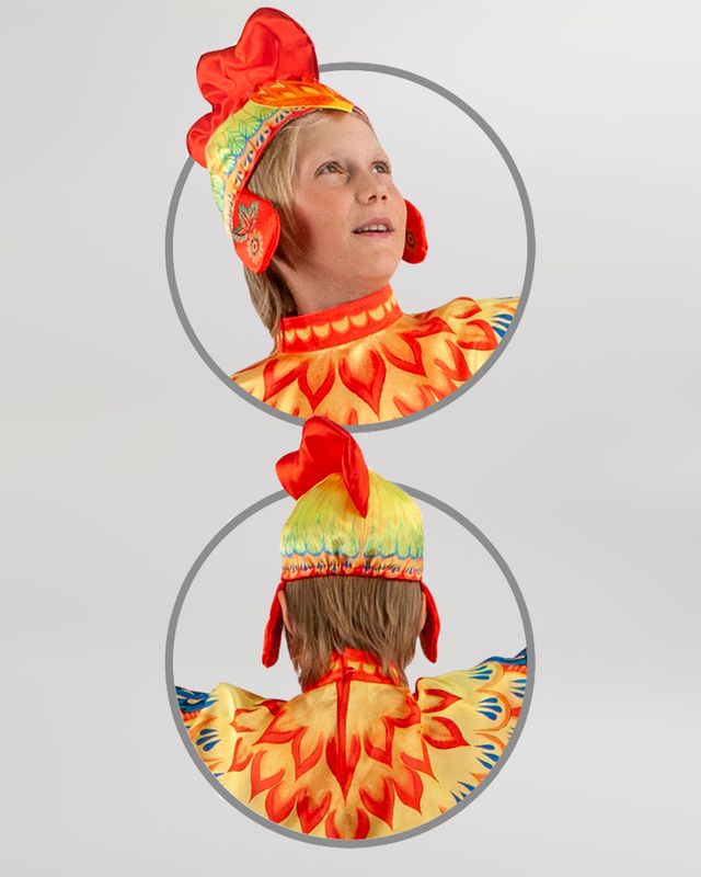 Петух головной убор с хохолком детскийГоловной убор петуха – шапка четырехклинка, выполнен из креп-сатина. На креп-сатин нанесен дизайнерский рисунок. По верхней части шапки пришит красный гребешок, гребешок наполнен синтепоном. По нижнему краю головного убора на уровне боковых швов пришиты фигурные сережки, наполненные синтепоном. По центу настрочен декоративный элемент из фетра имитирующий перья. Головной убор на стеганной подкладке с синтепоном. В заднюю часть головного убора вшита резинка, что позволяет регулировать размер.Брюки выполнены из желтого креп-сатина. Брюки прямые, свободные, без бокового шва. Верхний срез брюк обработан швом в подгибку. В шов вставлена эластичная тесьма – резинка, для удобства фиксации и регулировки по размеру. Низ брюк, обработан швом в подгибку с обметанным срезом.