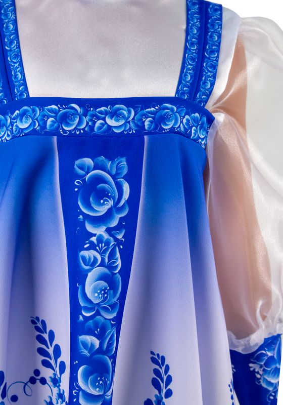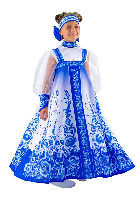Гжель удлиненный костюм для девочки с бантом Русский народный костюм Снегурочка Гжель для выступлений на утренниках с новогодней тематикой, концертах и творческих конкурсах. Подойдет для образов на театрализованные выступления и костюмированные фотосессии. Костюм в русском народном стиле будет ярким акцентом в костюмерной детского сада! Костюм состоит из сарафаны, блузы и головного убора. Сарафан Снегурочка Гжель из габардина. Габардин — плотный материал с матовой поверхностью. Ткань не тянется и не деформируется во время использования. Материал долговечен и хорошо держит форму. Сарафан в пол с юбкой полусолнце подойдет девочке любой комплекции — регулируется по ширине груди эластичной резинкой со стопором. Лямки подгоняются по росту пуговицами с петлями. Блуза из креп-сатина с рукавами из органзы. Манжет из эластичного бифлекса комфортно сидит на запястье. Блуза застегивается на спине на пуговицу. Головной убор Бант изготовлен из габардина. Фиксируется с помощью потайной резинки. При необходимости можно отрегулировать эластичную резинку по размеру. Рисунок создан художниками по русскому прикладному искусству, поэтому русский народный костюм Снегурочка Гжель можно использовать как дидактическое пособие. Принт нанесен при помощи сублимационной печати. В сублимационной печати используют гипоаллергенные краски, они сохраняют яркость после 100 стирок, не выгорают со временем. Рекомендуется стирать костюм Снегурочка Гжель в стиральной машинке при температуре 30°C и хранить защищенным от пыли и дневного света. Больше новогодних костюмов для детей смотрите в разделе Новогодние костюмы.