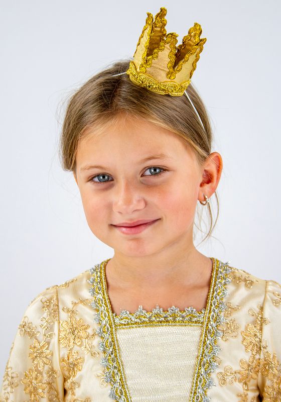 Костюм Принцессы / Золушки для девочки. Костюм Принцессы для девочки предназначен для спектаклей, костюмированных праздников, новогодних елок. Благодаря обилию сверкающих декоративных элементов, он особенно выигрышно смотрится на сцене. Платье изготовлено из креп-сатина и покрыто сверху золотой сеткой, богато расшитой декоративными шнурами и пайетками. Лиф, ворот и рукава украшены металлизированной тесьмой. Лиф платья на хлопчатобумажной подкладке. Платье застегивается позади на молнию. Прилегание платья по груди и талии, регулируются с помощью шнуровки на спине. Дополняет наряд Принцессы, маленькая корона, выполненная из золотой парчи украшенная тесьмой. Платье без подъюбника. Для создания дополнительного объема юбки используйте кринолин (приобретается отдельно). Костюм принцессы для девочки прослужит несколько десятков лет, если за ним бережно ухаживать. Рекомендации по уходу платьем: - ручная стирка при температуре до 30°C без отбеливателей, не скручивать и не отжимать; стараясь не сминать декоративные элементы. - сушить в расправленном виде на каркасе. - хранить в чехле, защищая от пыли и солнечного света. Рекомендации по уходу платьем: - стирать нельзя, загрязнение удалять сухой щеткой. - хранить в чехле, в расправленном виде, не сминать.