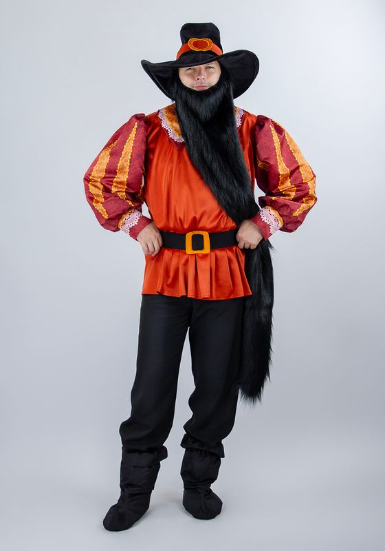 Карабас - Барабас костюм для взрослого Сказочный костюм для взрослого «Карабас-Барабас», полностью соответствует каноническому образу знаменитого персонажа. Может использоваться для театрализованных представлений, спектаклей, утренников. В комплект входят: кафтан, брюки, имитация сапог, головной убор, борода и ремень. Основа кафтан - бежевый атлас стрейч. Перед на подкладке, с имитацией живота. Длинные широкие рукава с притачными манжетами. По окату и низу рукава выполнены складки. Широкий вырез горловины с отложным воротником. Воротник и рукава выполнены из Сатена. На воротнике и рукавах, нанесен принтованный дизайнерский рисунок. Узор имитирует кружево и отделку, что повышает художественную выразительность костюма. И кофта застегиваются сзади на пуговицу по горловине. Спереди по талии кафтан выполнены складки – это акцентирует внимание на выпуклом накладном животе. Брюки из черного габардина с поясом на резинке для регулировки размерности. Имитация сапог выполнена из черной плащевой ткани с отворотами, манжетами и заостренными носами. Вверху и внизу вставлены резинки для удобной посадки вне зависимости от размера ноги. Широкополая шляпа из бархата с подкладкой из стёжки. Украшена бежевой широкой лентой и большой фетровой пряжкой. В края шляпы вставлен регилин для жесткости полей, что обеспечивает фиксацию формы. Борода выполнена из черного длинноворсового искусственного меха, имитирующего волосы. Фиксируется на резинке. Ремень из плащевой ткани дополнен крупной пряжкой, застегивается на липучку. Для более надёжной фиксации внутрь вставлена резинка. При изготовлении маскарадного костюма большое внимание уделено качеству швов: из кофты обработан в подгибку, борода обметана на оверлоке, края шляпы обработаны бейкой. При надлежащем уходе костюм Карабаса-Барабаса прослужит несколько лет, радуя детей на всех праздниках. Рекомендации по уходу: - деликатная ручная стирка при температуре до 30°C без отбеливателей; - глажка при температуре 110-150°C; - хранить в чехле, защищая от пыли и солнечного света.