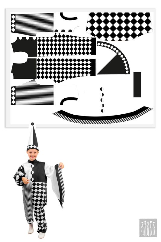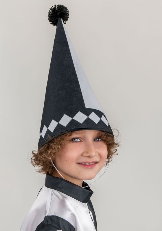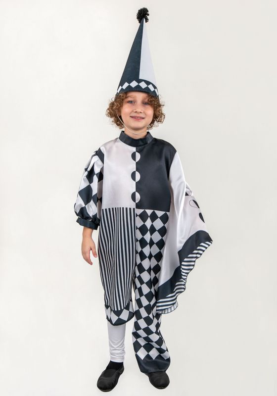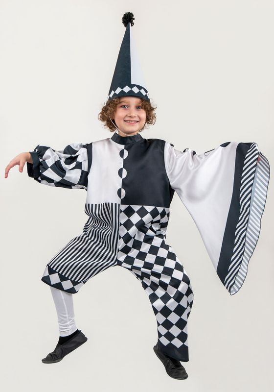 Пьеро костюм для детей. Необычный арт - Костюм детский Пьеро для постановки сказки Буратино и других театрализованных выступлений, творческих конкурсов, утренниках с любой тематикой. Костюм Пьеро будет ярким акцентом в костюмерной детского сада!Костюм Пьеро создан из материала креп-сатин. Комбинезон свободного кроя, не стесняет движения. Правый рукав-фонарик имеет длину 3/4. Левый рукав расклешенный к низу. Брючины созданы с разной длинной. На правую ногу в комплекте идет один гетр — материал бифлекс. Фиксируется на голени резинкой. Комбинезон застегивается на потайную молнию на спине, поэтому надевается очень удобно. Каркас колпака из плотного фетра. Фиксируется на резинку под шеей, благодаря чему колпак хорошо держится на голове. На ткань нанесен принт при помощи сублимационной печати.В сублимационной печати используют гипоаллергенные краски, они сохраняют яркость после 100 стирок, не выгорают со временем.Рекомендуется стирать комбинезон Пьеро в обычной стиральной машинке при температуре 30°C. Колпак нельзя скручивать и отжимать.Сушить в горизонтальном положении. Костюм детский Пьеро, когда не используете его, храните защищенным от пыли и дневного света и тогда ваш костюм будет выглядеть как новый много лет.Больше костюмов для героев сказок смотрите в разделе Сказочные герои.