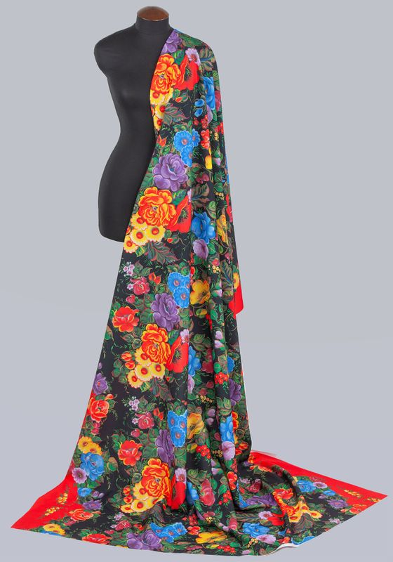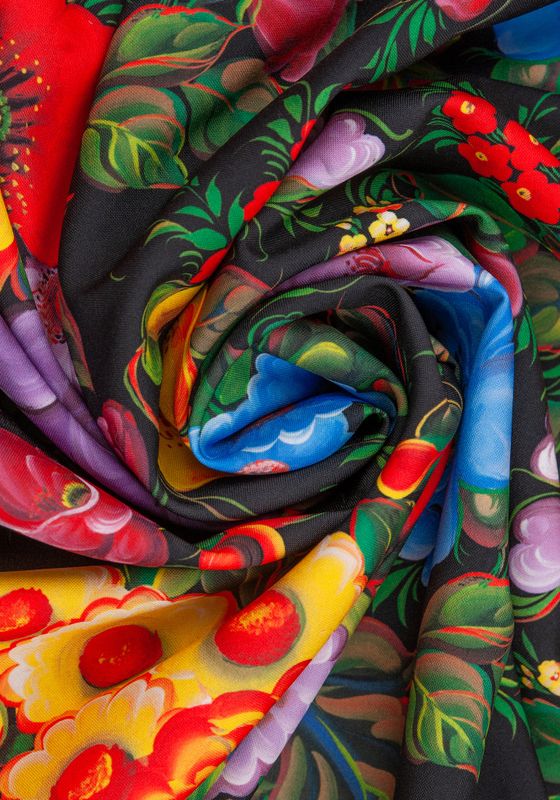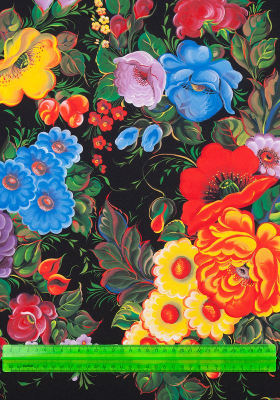 Ткань с «Росписью Жостово» - это русский народный орнамент. Ткань для пошива в традиционном русском стиле с колоритным узором Жостово знают во всем мире.Традиционными считаются цвета: яркий узор на черном фоне. Все эти классические цвета есть в нашей палитре ткани с «Росписью Жостово ». Узор ткани состоит из цветущих бутонов. Художники Мастерской Ангел, при составлении узора, оставляют самые характерные элементы, сохраняя традиции русской прикладной живописи.Узор состоит из крупных элементов мира природы, листиков и завитков, нанесенных на поверхность ткани. Такая ткань будет эффектно выглядеть на сцене и на выступлении русского народного хора или ансамбля русского народного танца. Рисунок ткани для пошива словно иллюстрация к сказке.Цветущие растения и спелые плоды в узорах Жостово считались на Руси пожеланием добра, благополучия и счастья. Эту прекрасную традицию сохраняют сегодня художники Мастерской Ангел, украшая ткань нарядной росписью.Ткань для карнавальных костюмов или выступлений на сцене от Мастерской Ангел можно стирать после каждого выступления. Цвета оставляют свою яркость, а фактура ткани не деформируется. Ткань для пошива русских народных костюмов, сарафана, рубахи, пелерины, кокошника, жилета, коротены, кафтана, кички рогатой, поневы, передника, сороки, картуза. Ткань с «Росписью Жостово » — это классическая палитра красок для шитья предметов одежды в исконно русском стиле для фольклорных ансамблей и народно-этнографичесских коллективов, певческих хоров. Наследие традиций русской культуры запечатлено в узорчатых рисунках на ткани Мастерской Ангел. Русский образ уместен не только для проведения тематических мероприятий. Карнавальный костюм, пошитый из ткани с «Росписью Жостово», может использоваться на праздничные выступления на масленичных гуляньях. На ткань нанесён принтованный рисунок авторской работы по уникальным эскизам, имитирующий старинный русский промысел – Жостовскую роспись с классическим узором.Больше тканей для пошива костюмов или декора в русском народном стиле смотрите в разделе Ткани для костюмов.В Мастерской Ангел вы можете купить русскую народную ткань из любого материала: креп-сатин, шифон, габардин.