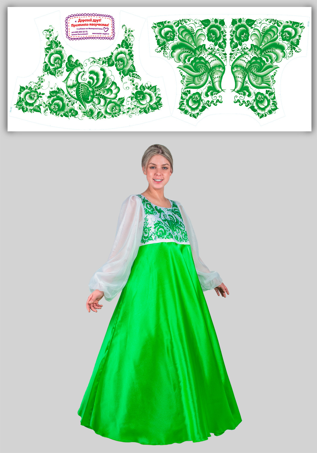 Гжель Весна расписная платье женское Женское платье изготовлено из ткани креп-сатин, состав 100% полиэстер. Платье состоит из лифа, украшенного росписью, и струящейся юбки-полусолнце. Роспись выполнена в технике Гжель, но в нетрадиционном зеленом цвете. Нижняя часть платья с мягко ниспадающими фалдами стройнит фигуру. Рукава двухслойныые и выполнены из органзы со сборкой на запястье. За счет полупрозрачности материала рукава выгдядят легкими и воздушными. Такое платье подойдет и для нежного романтичного образа Весны, и для Масленичных гуляний, и для русских народных выступлений. Платье можно стирать вручную при температуре не выше 30°С, утюжить в режиме "Шелк", хранить в защищенном от пыли и света месте в специальном чехле. При соблюдении этих правил платье прослужит более десяти лет. Завершить образ Весны Вам поможет головной убор - кокошник. Изделие можно приобрести в два раза выгоднее, если выбрать набор для рукоделия, который включает в себя все необходимые материалы для самостоятельного изготовления изделия: инструкцию по пошиву, ткань с нанесенными деталями кроя, швейную фурнитуру.