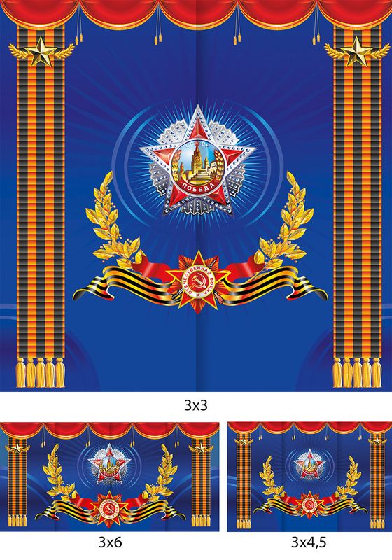 День Победы - Декорация / Занавес сцены Занавес специально разработан Мастерской Ангел для оформления музыкального зала в детском саду, школах, театральных сцен и других помещений, требующих эстетичного и функционального декора. Декорация из Премиум габардина - ткань полотняного переплетения, состав 100% полиэстер, плотность материала 180 г/м². Материал прочный, не подвержен деформации и хорошо держит свою форму. За счет плотного переплетения устойчив к износу, не выцветает на солнце и легко поддается стирке, что обеспечивает долгий срок службы изделия.Занавес состоит из отдельных полотен с печатным рисунком. Печать выполняется на японском оборудовании Mimaki оригинальными чернилами с профессионально настроенными цветовыми профилями, что позволяет точно передать цвета и четкость рисунка. Ткань с принтом сохраняет яркость после стирки, не линяет и не выгорает.Ширина занавеса в готовом виде: 3 метра - 2 полотна; 4,5 метров - 3 полотна; 6 метров - 4 полотна; либо по меркам заказчика. Высота занавеса в готовом виде: 2,8 метра; 3 метра; либо по меркам заказчика.Боковые срезы и нижний край полотен обработаны швом в подгибку с закрытым срезом. Верхний срез обработан швом с закрытым срезом с притачанным креплением. Варианты креплений на выбор:- шторная лента шириной 4 см.;- контактная лента «Велкро» шириной 5 см.;- петли для круглого карниза шириной 1,5-3 см.;- без креплений.Крепление приобретается отдельно.Полотна подписаны и пронумерованы для удобства монтажа и правильной последовательности рисунка. Соединение рисунка происходит за счет нахлеста полотен по верхнему срезу контактной лентой-липучкой «Велкро», нахлест ⁓ 6-10 см.Размер занавеса может отличаться на 3-5% - это стандартная величина усадки при термообработке ткани.Рекомендации по уходу:Стирка при температуре до 30°C, без отбеливателей.Глажка при температуре 110-150°C.Хранить занавес, смотанным в рулон на втулку, защищая от пыли и солнечного света.